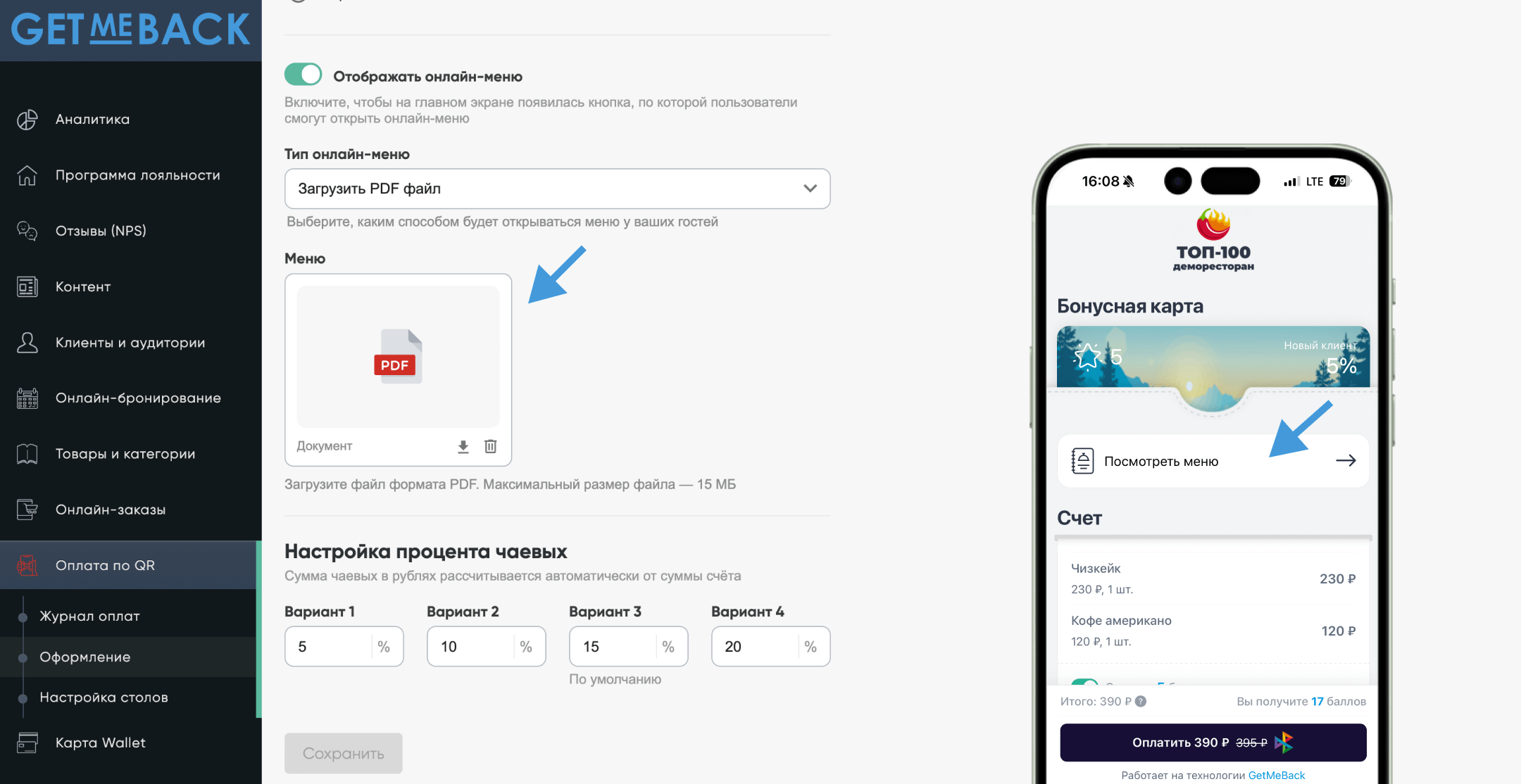В единый QR-код для списания и начисления баллов, оплаты счета и чаевых появилась возможность добавить онлайн-меню вашего заведения.