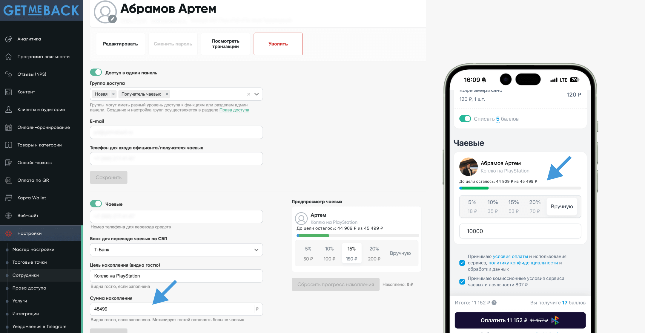 Мотивируйте гостей оставлять больше чаевых, указав сумму и цель накопления для каждого официанта. Гость не только увидит эту информацию в момент оплаты, но и сможет в реальном времени наблюдать, как изменится шкала прогресса после того, как он введет сумму чаевых.